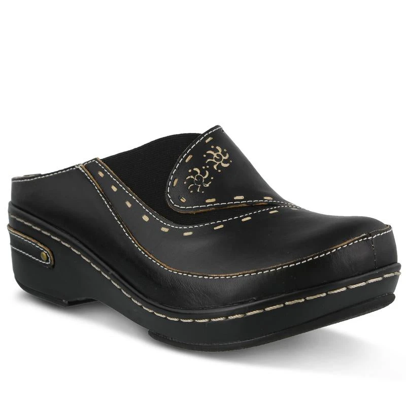 Hand painted, open-back, leather clog with elastic piecing and contrast embossed design.